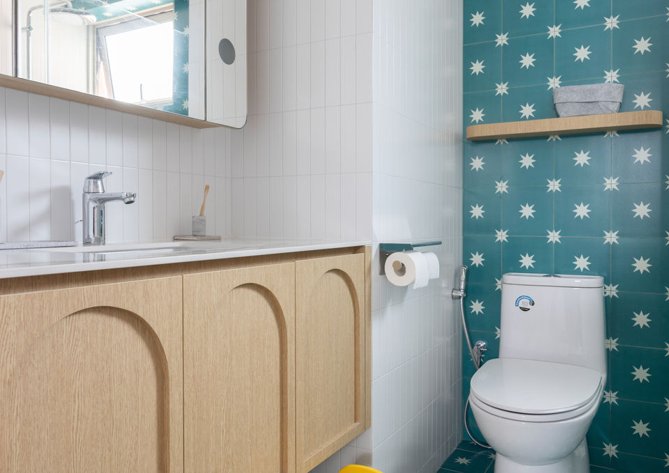 This stunning interior combines vibrant pops of color with rich textures and playful patterns to create a unique and inviting living space. From the bold teal cabinetry to the warm wood tones and soft textiles, every detail adds depth and character. Perfectly balanced, the design creates a space that feels both lively and cozy.